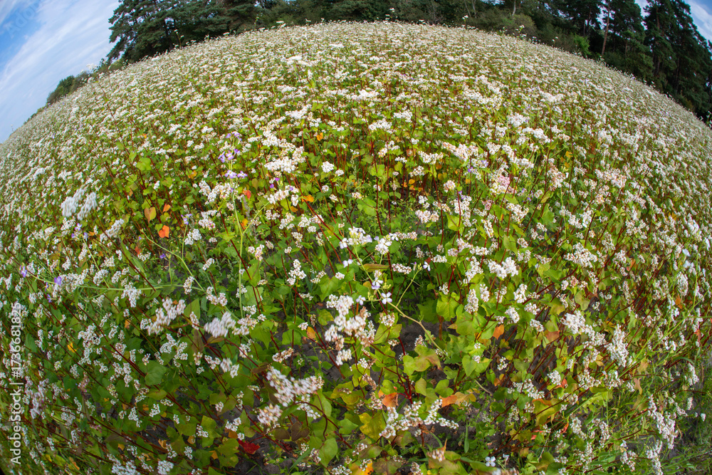 Blooming buckwheat field with fisheye lens effect