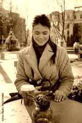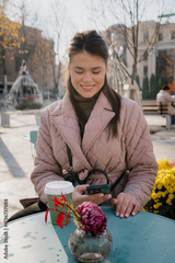 Smiling woman in a pink quilted coat sits at an outdoor cafe, checking her phone beside a coffee cup and a vase of flowers.