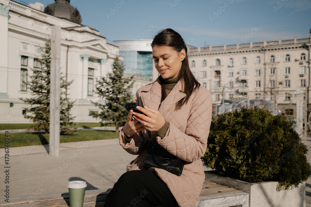 A woman in a pink coat sits on a bench outdoors, texting on her smartphone with a coffee cup nearby.