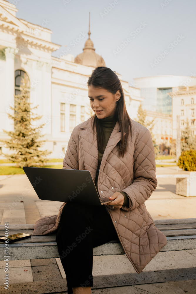 Woman sits on a bench with a laptop in hand, in a city square during daytime.