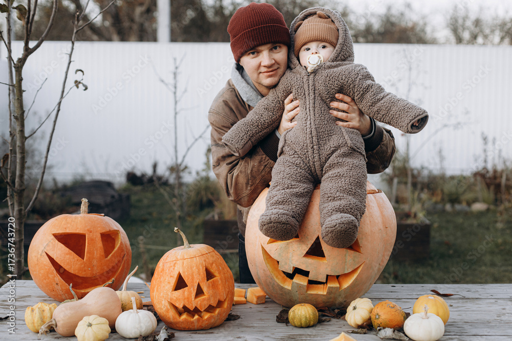 Family carving halloween pumpkin. Happy father and cute baby son in bear costume at carved pumpkins on wooden table outdoors. Making a jack o lantern, halloween preparation. Trick or treat