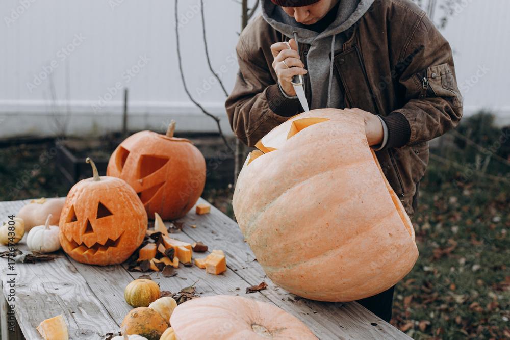 Happy man making a jack o lantern and carving halloween pumpkin on rustic wooden table in autumn garden. Fall harvest and Halloween preparation. Happy Halloween
