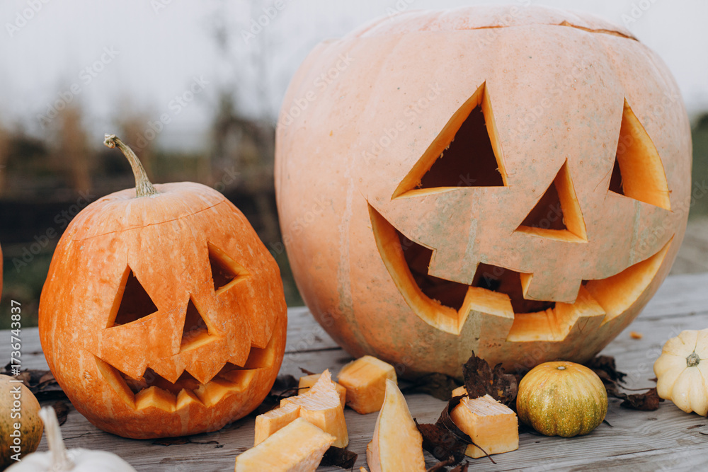 Carved halloween pumpkins on rustic wooden table in autumn garden, close up. Fall harvest. Cutting pumpkin, making a jack o lantern. Halloween preparation
