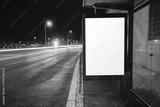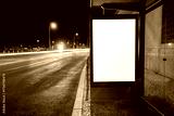 Blank illuminated advertising board at a bus shelter beside a wet city road at night, captured with long exposure car light trails and glowing street lamps