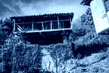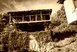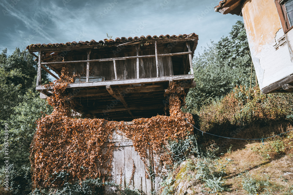 Old traditional wooden horreo granary covered with dry climbing ivy leaves, rustic weathered facade, clay tile roof and countryside vegetation under dramatic blue sky