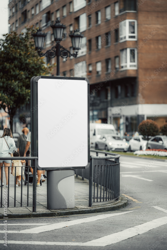 Vertical city billboard mockup with blank white advertising space on a modern frame, placed at urban street corner with cars, pedestrians, and buildings in the background