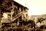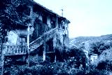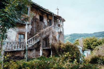 Abandoned rustic house with crumbling walls, broken windows, and ivy-covered staircase, surrounded by overgrown vegetation and countryside hills in the background