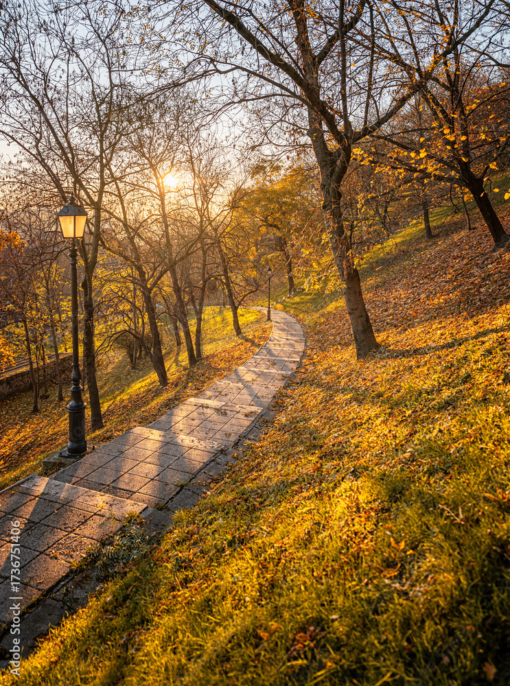 Autumn Park Pathway at Sunset in Budapest, Hungary