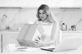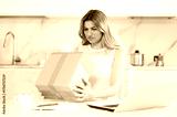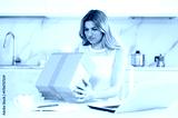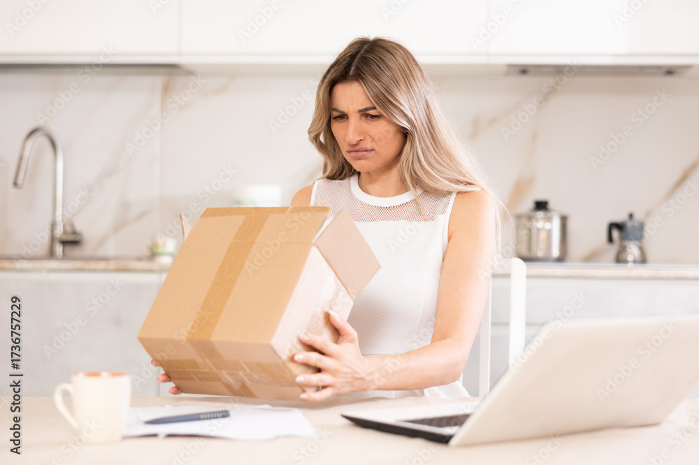 Wrong package. Upset woman with unpacked box in kitchen, sad about shipping mistake, frustrated lady displeased by bad delivery service