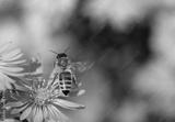 A small honeybee lands on an aster and is photographed from above. The asters bloom in purple and yellow colors.