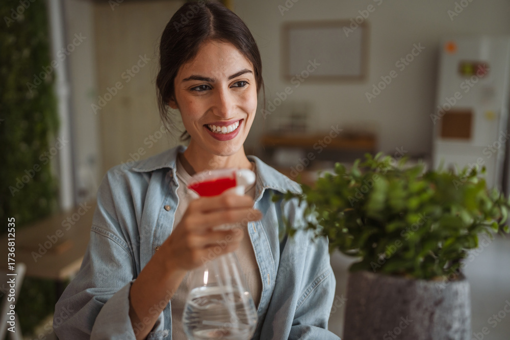 Happy woman holding potted plant and spray bottle