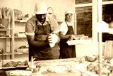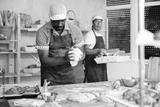 Professional African baker in maroon apron kneading dough on flour-covered table in artisan bakery shop, surrounded by freshly baked bread and pastries arranged on wooden shelves