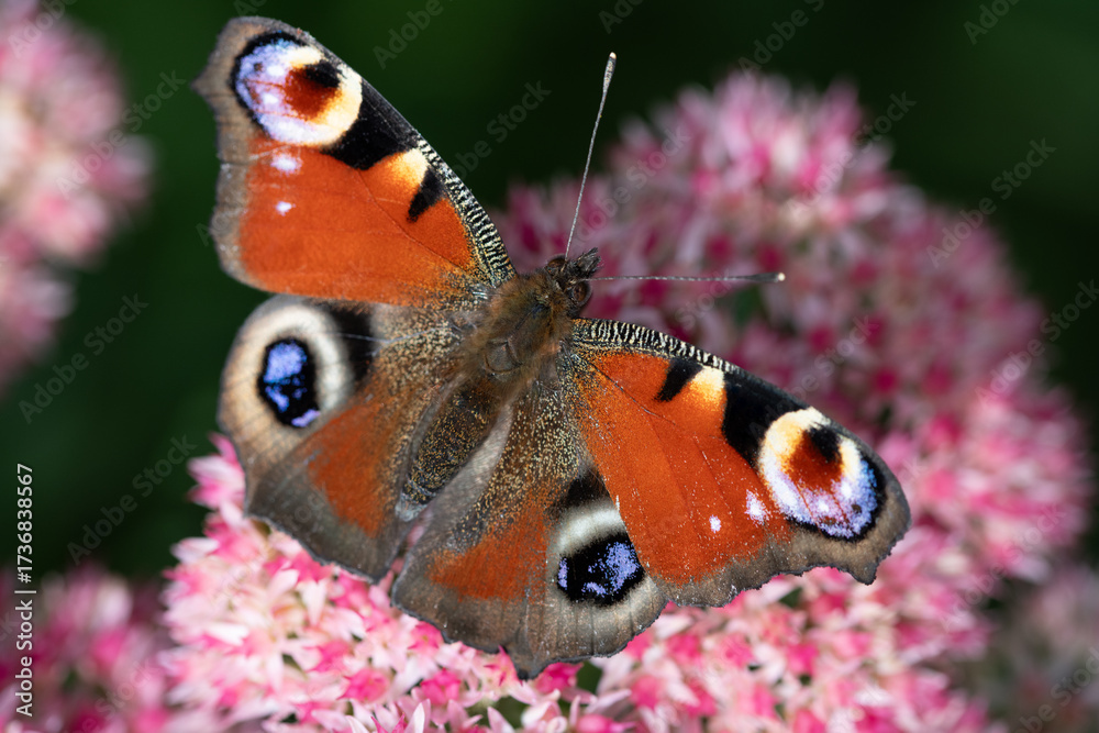 A butterfly, a peacock butterfly, sits on a red flower, a stonecrop (Sedum), searching for pollen and food.