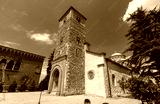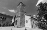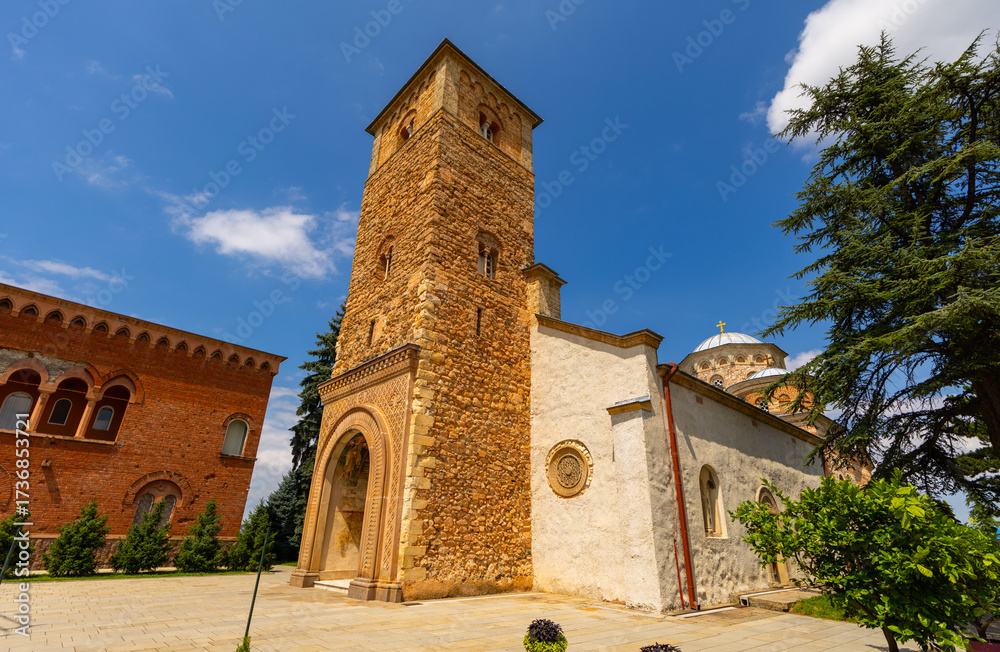 Zicha Monastery - religious buildings are made in various architectural styles, Serbia. Monastery courtyard, well-groomed territory, summer day at Orthodox monastery