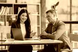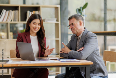 Two Confident male and female professional executives experts discussing financial accounting papers working together