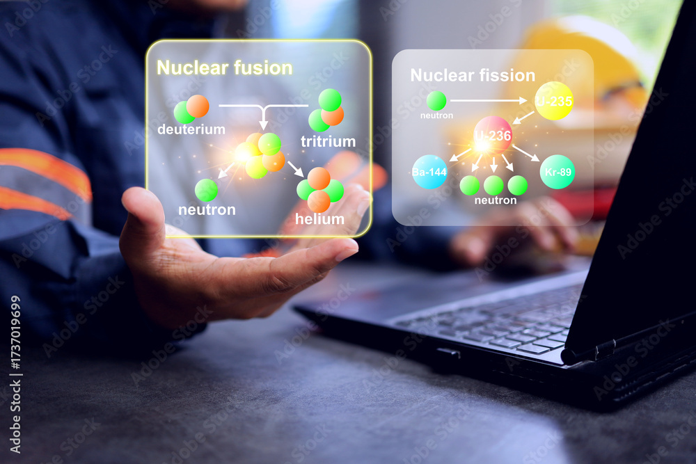 Nuclear energy concept with an engineer holding fusion reactions to produce electricity and obtained from nuclear fission and fusion reactions