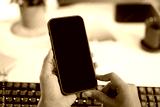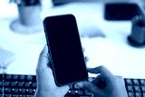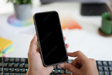 Hand holding smartphone with white blank mock up screen over office desk table with cup of coffee and supplies