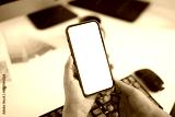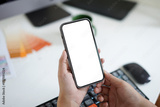 Hand holding smartphone with white blank mock up screen over office desk table with cup of coffee and supplies