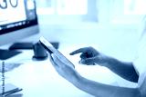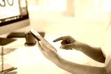 A woman is using a cell phone to point at a screen. The phone is on a desk next to a computer monitor. The woman is focused on the screen, possibly checking her email or browsing the internet