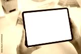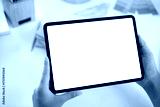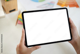 Close up of woman hand holding digital tablet with blank screen on working table background for mock up, template