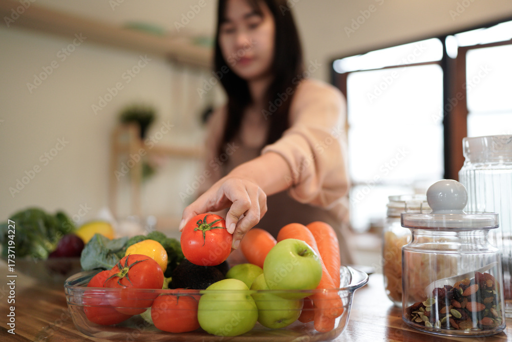 Young asian woman in striped apron holding a red tomato in a kitchen surrounded by fresh vegetables and greens