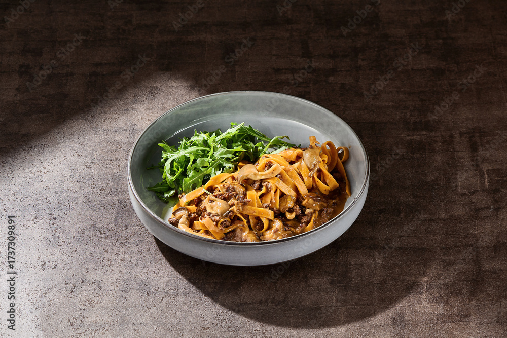 Tagliatelle pasta with mushroom bolognese and arugula, bright lighting, overhead composition