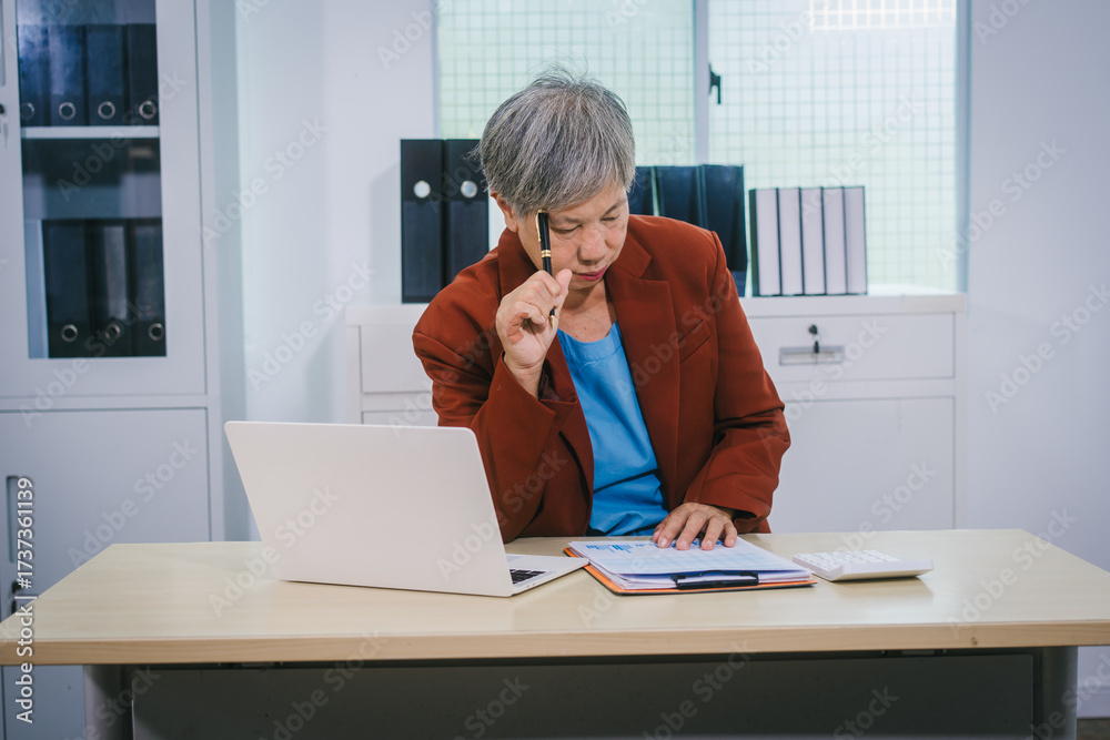 Senior Asian woman with professional office experience, focusing on reviewing financial reports and investment documents, reflecting her expertise in business, finance, and investment strategy