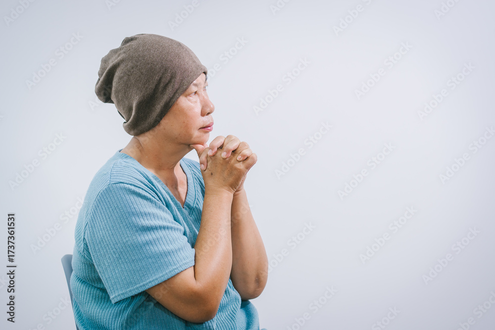 An elderly Asian woman wearing a gray-brown beanie, a light blue shirt, and dark pants sits quietly as she feels stressed from chemotherapy-related hair loss, the hopelessness associated with cancer