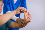 An Asian female nurse provides caring home care to an elderly woman, assisting with arm movement exercises, physical therapy,and rehabilitation to improve joint function, strength,overall well-being