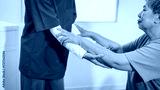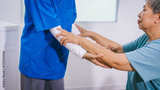 An Asian female nurse provides caring home care to an elderly woman, assisting with arm movement exercises, physical therapy,and rehabilitation to improve joint function, strength,overall well-being