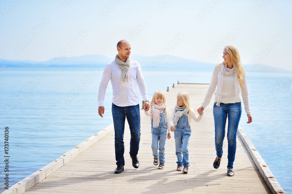 A young, friendly family: father, mother and two daughters are walking along the sea pier on a warm autumn day and having fun. They are happy.