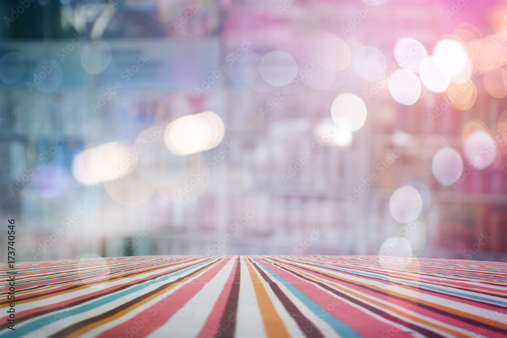 Empty table with red polka dot tablecloth over abstract blur bokeh background