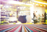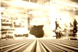 Empty table with red polka dot tablecloth over abstract blur bokeh background