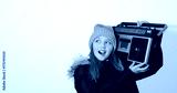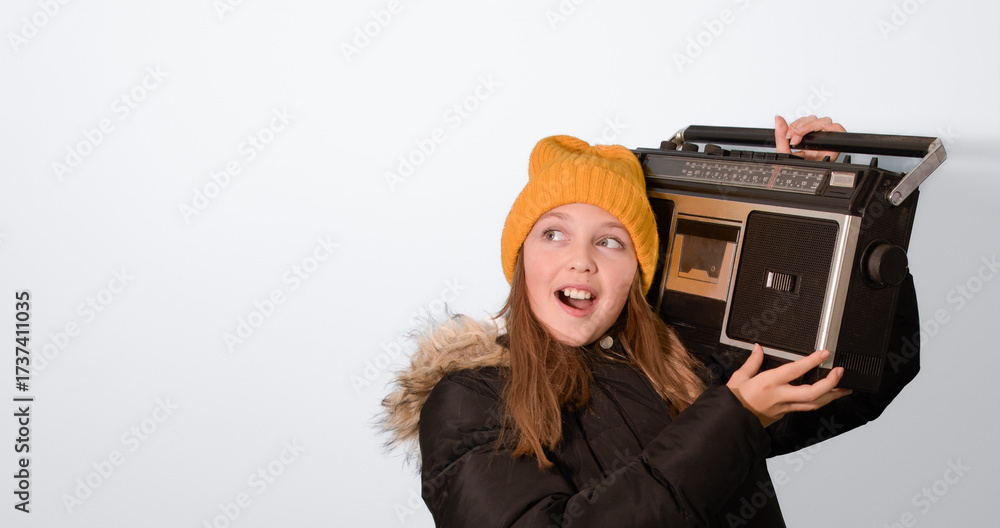 Banner with teenage girl wearing winter clothes and a tape recorder in the 90s