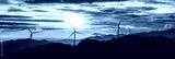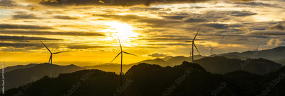 Wind turbines silhouette on the mountain ridge generating clean renewable energy against a beautiful golden sunrise sky