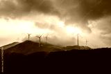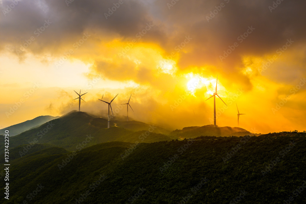 Wind turbines on a misty mountain generating renewable energy against dramatic golden sunrise sky
