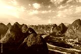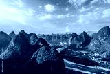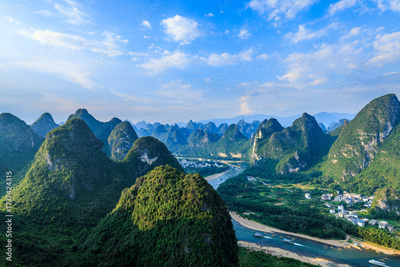 Aerial shot of the beautiful karst mountain and river with green valley natural landscape in Guilin, China.