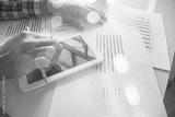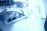 Image of male hand pointing at business document during discussion at meeting