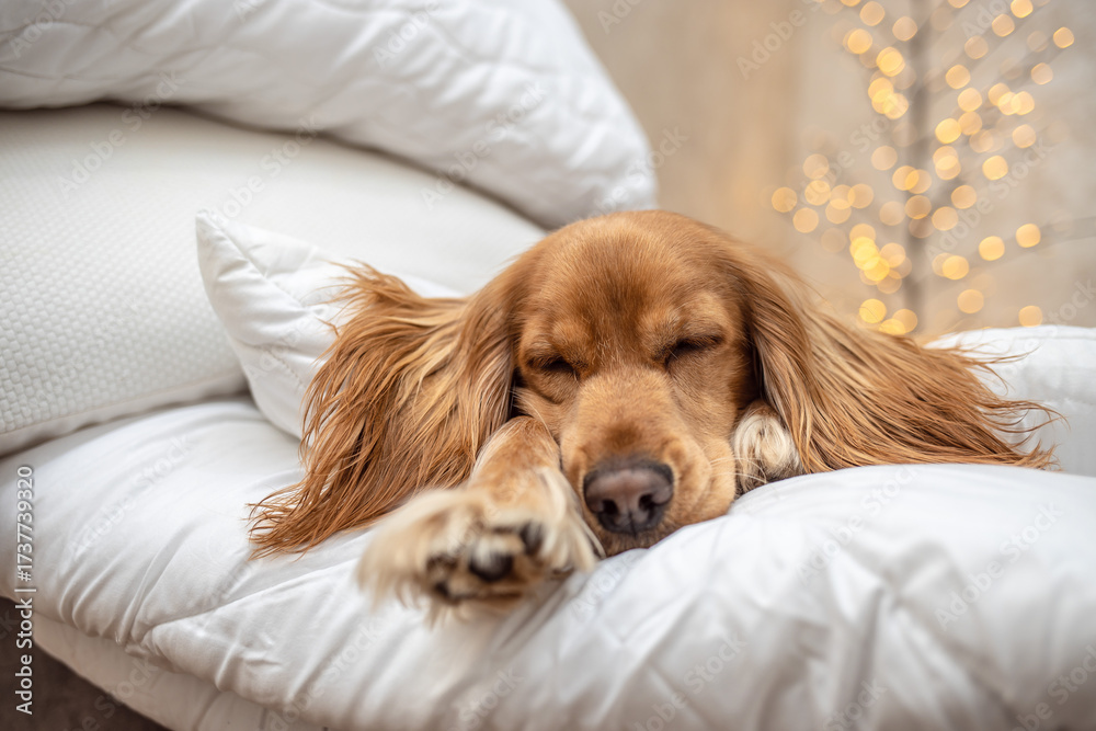 Adorable dog resting on soft white pillows with festive warm lights creating a cozy Christmas atmosphere.