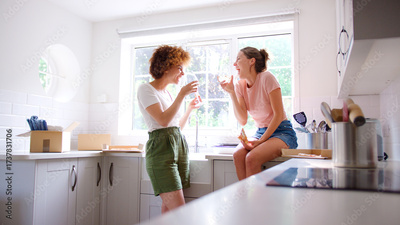 Two Female Friends Or Same Sex Couple Celebrating With Pizza And Wine On Moving Day In New Home