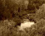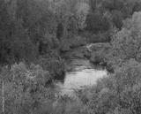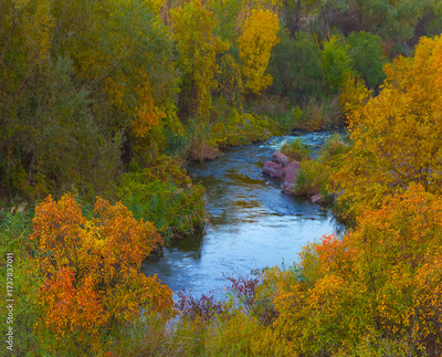 view to the river flow among red autumn forest