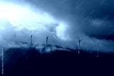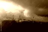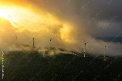 Wind turbines generating renewable energy on a mountain ridge shrouded in fog against spectacular golden sunrise sky