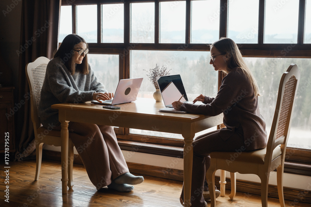 Two women colleagues working at home office with large window, both working on laptops. Collaborative workspace or relaxed working environment. dark ambient light.
