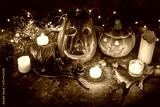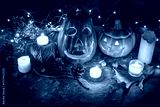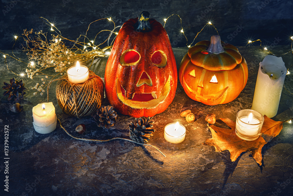 Halloween holiday. Pumpkin decoration with burning candles and jack-o-lantern face on dark rustic background copyspace place for text