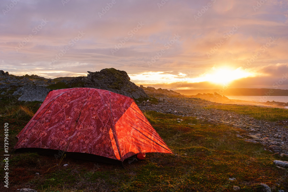 Russia, Murmansk region, Rybachy Peninsula. Sunset and a tent on the shore of the Barents Sea. August 2025