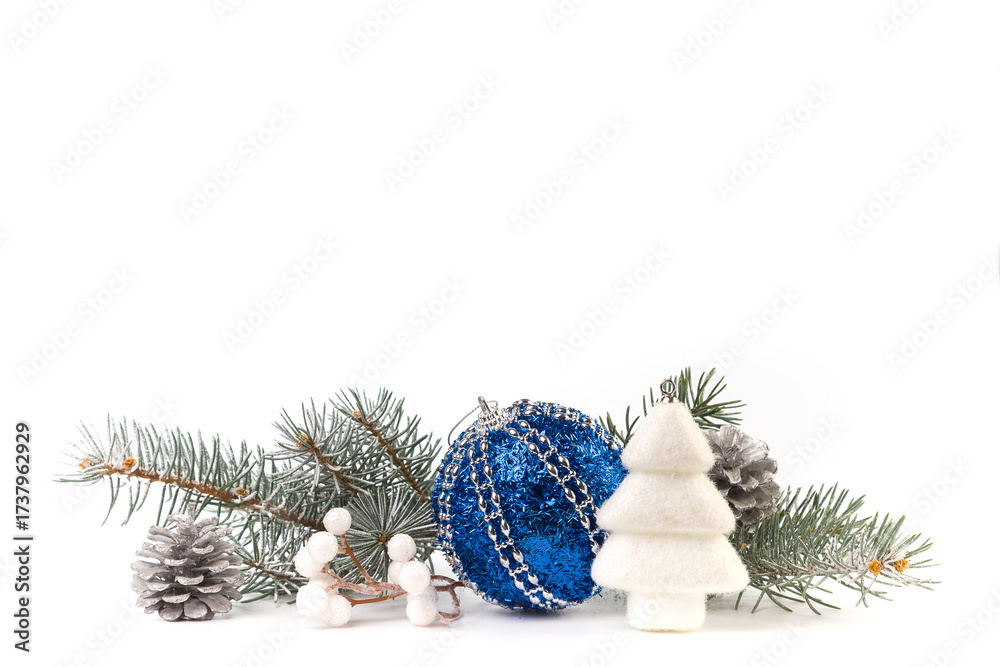 Christmas card with fir branches and Christmas decorations. Copy space
