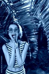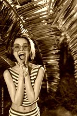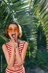 A cheerful woman wearing a red and white striped swimsuit and round orange sunglasses smiles with excitement in a sunny tropical garden, creating a vibrant, carefree mood.