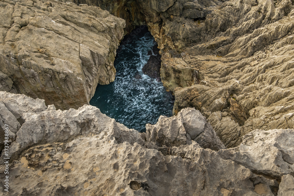 Blowhole and sharp limestones in the eastern coast of Asturias, northern Spain
