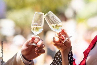 manos de una mujer y un hombre brindando con dos copas de vino fino manzanilla en la feria de jerez, andalucia, españa