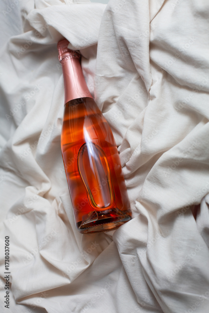 champagne sparkling wine bottle mockup with elegant rose-colored liquid resting on soft white fabric, showcasing luxurious design and inviting ambiance for creative projects